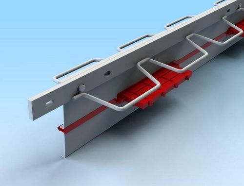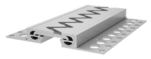 Угловое дилатационное устройство представляет собой профильную систему, состоящую из эластичного прочного компенсатора и двух металлических прижимных планок с отверстиями под анкеры. В данном изделии направляющие выполнены из анодированного алюминия.